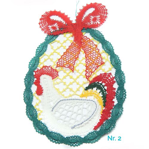sehr schön und perfekt geklöppelt, gut gestärkt. mit Faden zum Aufhängen.